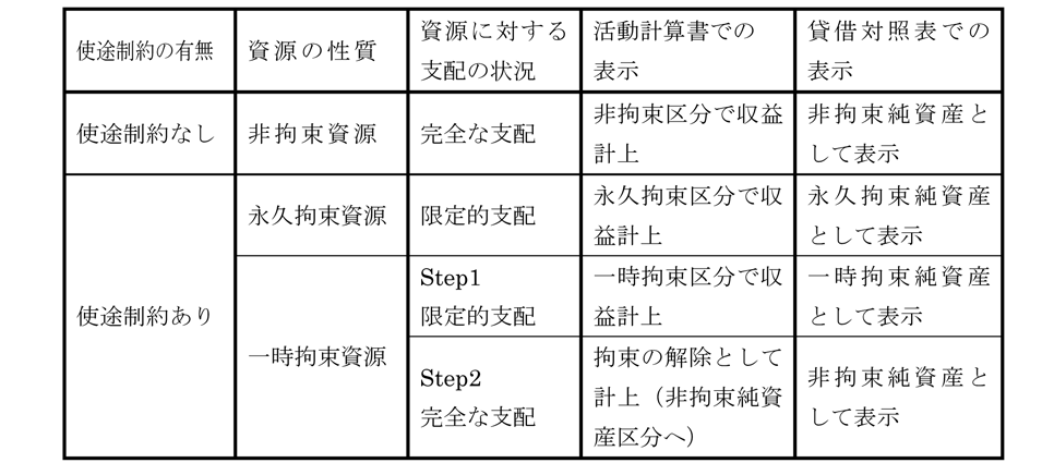 使途制約がある寄付金等を拘束別に区分して表示した財務情報は、非営利組織の受託責任の履行状況を評価する上で有用である。公益法人やNPO 法人(重要性が高い場合)といった民間非営利組織においては、寄付金等(寄付金、補助金、助成金等)を受け入れた際に正味財産の増加(収益)とされ、当該補助金等に使途制約があれば指定正味財産、なければ一般正味財産に区分処理される。この方法は、米国の非営利組織会計でも、また、日本公認会計士協会が非営利組織のモデル会計基準開発に向けて公表した三つの書類でも同様にとり入れられている。