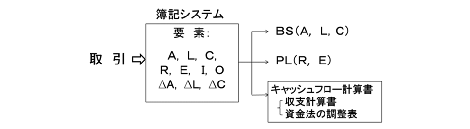 慣習的な複式簿記は、資本主説(P 説)にもとづいており、キャッシュフロー計算書は導出できない仕組みになっている。資本主説は、資産(A)から負債(L)を差し引いて資本(C)を求め、収益(R)から費用(E)を差し引いた純利益(P)が、期中の資本(C)の増加となって、期末の資本等式(A-L=C)の貸借一致を確認するという仕組みである。そのため、A.L.C の3 要素から貸借対照表を、R とE の2 要素から損益計算書を導くが、キャッシュフロー計算書を作成するための要素(収支の明細勘定と、資産・負債・資本の増減明細勘定)が組み込まれていないため、キャッシュフロー計算書が導けない。そのため、財務三表時代には、新しい工夫が必要となる。その工夫は日本で展開された。その詳細については佐藤 [2012b] を参照いただければ幸いである。これによって1987 年のFASB 基準書第95 号が理想としたキャッシュフロー計算書を作成することができる。そのイメージ図は次のとおりである。