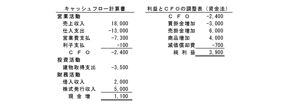 FASB[1987]が理想としていたキャッシュフロー計算書というのは、本体を直接法表示にして、それに「利益と営業キャッシュフロー(CFO)の調整表」を添付するというものであった。三元複式簿記は、このFASB の要請に合わせて開発したものだった。直接法のキャッシュフロー計算書の本体だけなら、染谷 [1956] が対応していた。FASB は利益とCFO の調整情報も求めている。そのようなキャッシュフロー計算書は次のような様式になる。