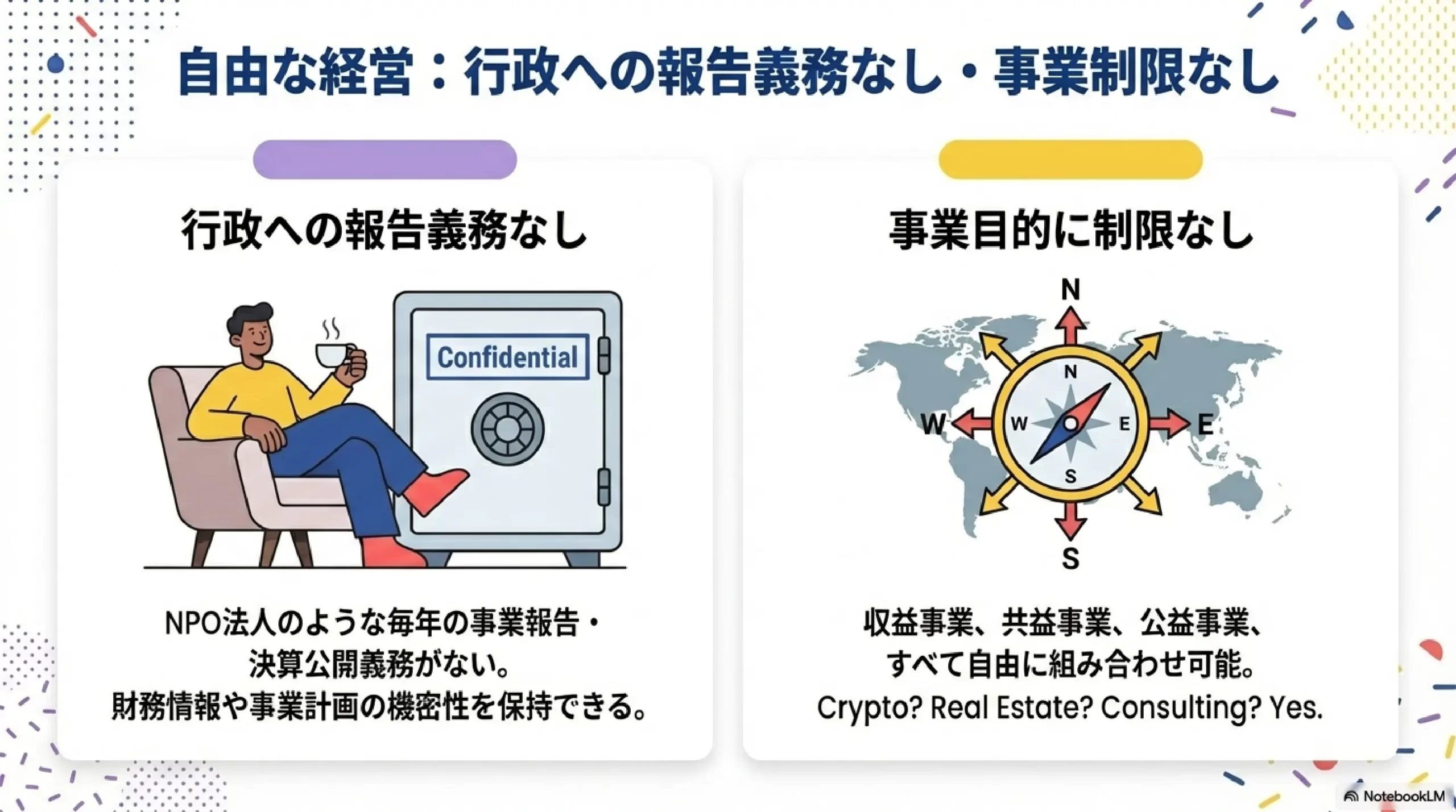 | (4)行政への報告義務なし | NPO法人のような行政監督なし。機密性を保ちつつ事業に集中可能 |